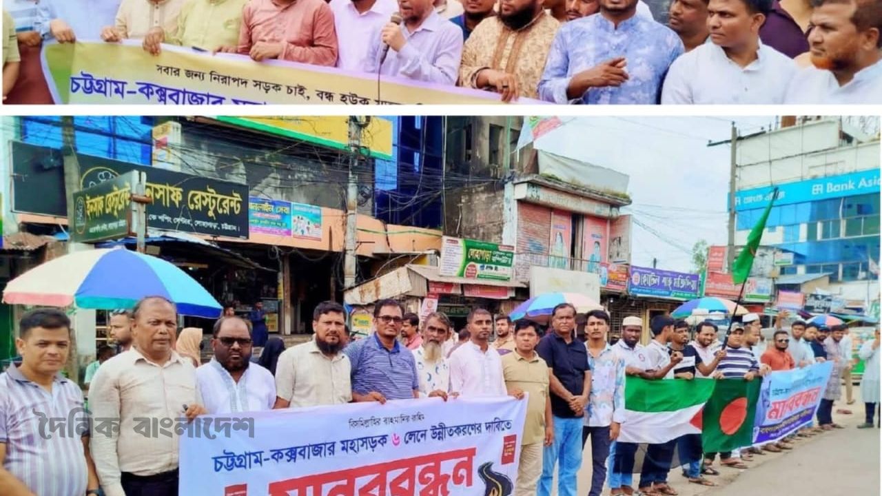 চট্টগ্রাম-কক্সবাজার মহাসড়ককে ৬ লাইন করার দাবিতে লোহাগাড়ায় মানববন্ধন অনুষ্ঠিত হয়েছে। শনিবার (৪ অক্টোবর) সকালে চট্টগ্রাম-কক্সবাজার মহাসড়ক ৬ লাইন বাস্তবায়ন পরিষদের আয়োজনে উপজেলা বটতলী মোটর স্টেশনে এই কর্মসূচি পালিত হয়।মানববন্ধনে সভাপতিত্ব করেন পরিষদের লোহাগাড়া আহ্বায়ক মাস্টার মো. ফারুক। প্রধান অতিথি ছিলেন লোহাগাড়া উপজেলা পরিষদের সাবেক চেয়ারম্যান এডভোকেট ফরিদ উদ্দীন খান। অ্যাডভোকেট রেজাউল করিমের সঞ্চালনায় মানববন্ধনে বক্তব্য রাখেন- সংগঠনের কেন্দ্রীয় কমিটির সদস্য সচিব নাছির উদ্দীন মিজান, কেন্দ্রীয় যুগ্ম আহ্বায়ক নাছির উদ্দীন, বড়হাতিয়া ইউপি'র সাবেক চেয়ারম্যান এম. ডি. জুনাইদ চৌধুরী, মানবাধিকার কমিশনের লোহাগাড়া উপজেলা সভাপতি হামিদুর রহমান, লোহাগাড়া প্রেস ক্লাবের সভাপতি এম. সাইফুল্লাহ চৌধুরী, উপজেলা রিপোর্টার্স ইউনিটি সভাপতি হোসেন মেহেদী, এনসিপি উপজেলা প্রধান সমন্বয়কারী জহির উদ্দিন, যুগ্ম-সমন্বয়কারী রিদওয়ান রায়হান, নিরাপদ সড়ক চাই লোহাগাড়া শাখার আহ্বায়ক মোজাহিদ হোছাইন সাগর, ডাকসু হল সংসদ সদস্য শাহেদ ইমন, যুবনেতা মিজানুর রহমান, সাংবাদিক খলিলুর রহমান, জামায়াত নেতা আরিফুল্লাহ চৌধুরী, আরিয়ান হাসান, নজরুল ইসলাম প্রমুখ। এসময় লোহাগাড়ার সর্বস্তরের জনসাধারণ, সাংবাদিক ও স্থানীয় নেতৃবৃন্দ অংশ নেন।বক্তারা বলেন, চট্টগ্রাম-কক্সবাজার মহাসড়ক দেশের একটি গুরুত্বপূর্ণ সড়ক। প্রতিদিন বিপুলসংখ্যক যানবাহন চলাচল করায় সড়কটি এখন অতিরিক্ত চাপ সামলাতে পারছে না।দ্রুত ৬ লাইনে উন্নীত করা না হলে বড় ধরনের যানজট ও দুর্ঘটনার ঝুঁকি বাড়বে। তারা হুঁশিয়ারি উচ্চারণ করে বলেন 'দাবি পূরণ না হলে মহাসড়ক অচল করে দেওয়া হবে।'