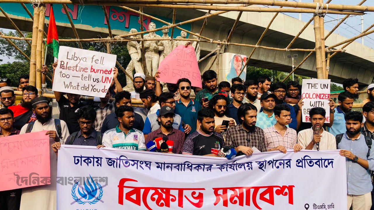 অন্তর্বর্তী সরকার কর্তৃক ঢাকায় জাতিসংঘের মানবাধিকার কার্যালয়ের মিশন চালু করার প্রতিবাদে আজ রোববার, ২০ জুলাই ২০২৫ বিকেল ৪’টায় ঢাকা বিশ্ববিদ্যালয়ের টিএসসির রাজুতে বিক্ষোভ সমাবেশ করেছে ‘বিক্ষুব্ধ শিক্ষার্থীবৃন্দ’ ব্যানারে ঢাকা বিশ্ববিদ্যালয়ের শিক্ষার্থীরা।